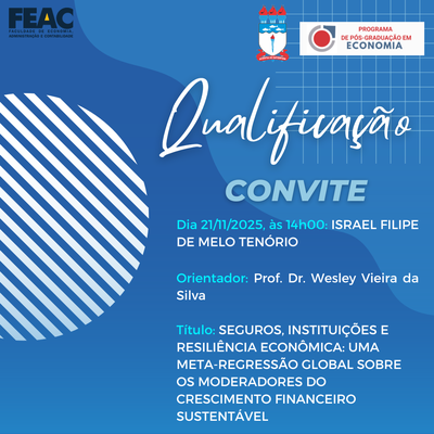O Programa de Pós-Graduação em Economia o(a) convida para a Qualificação do discente ISRAEL FILIPE DE MELO TENÓRIO, conforme banner anexo.