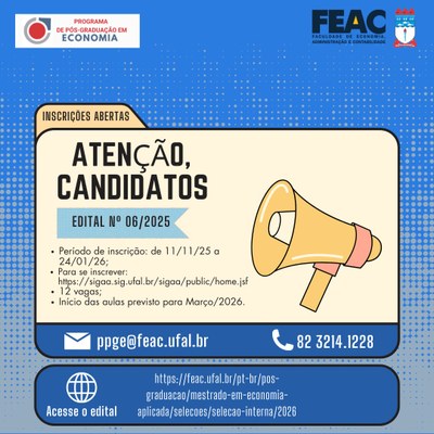 O Edital nº 06/2025 já está disponÃvel! Se você deseja ingressar no Mestrado em Economia da UFAL pela seleção interna, esta é a sua oportunidade. 🔹 PerÃodo de inscrição: 11/11/2025 a 24/01/2026 🔹 12 vagas disponÃveis 🔹 InÃcio das aulas previsto para março/2026 Todas as informações sobre requisitos, etapas da seleção e documentação estão no edital. Acesse o link e confira antes de realizar sua inscrição. 📨 Dúvidas? Entre em contato: ppge@feac.ufal.br 📎 Acesse o edital: https://feac.ufal.br/pt-br/pos-graduacao/mestrado-em-economia-aplicada/selecoes/selecao-interna/vbhsvshnda/ed-06-2025-selecao-mestrado-2026-1.pdf/view