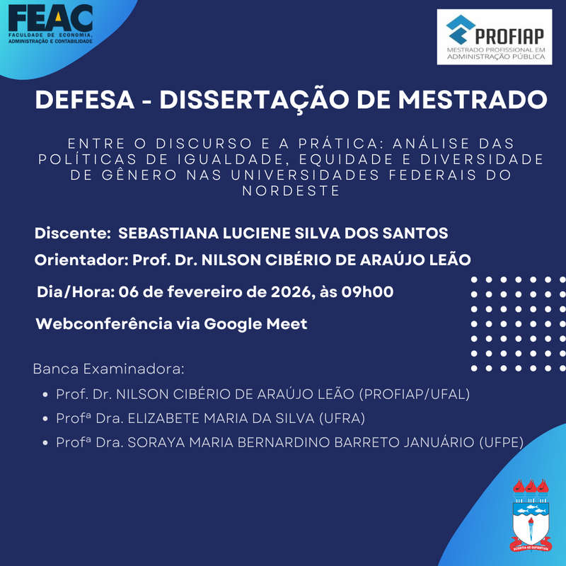 O Programa de Pós-Graduação Profissional em Administração Pública o (a) convida para a Defesa de Dissertação da discente SEBASTIANA LUCIENE SILVA DOS SANTOS, conforme banner anexo.