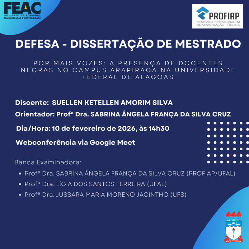 O Programa de Pós-Graduação Profissional em Administração Pública o (a) convida para a Defesa de Dissertação da discente SUELLEN KETELLEN AMORIM SILVA, conforme banner anexo.