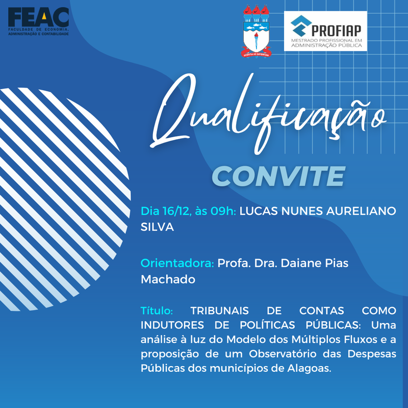 O Programa de Pós-Graduação em Administração Púbica em Rede Nacional convida os interessados para a Qualificação do Projeto de Dissertação do aluno LUCAS NUNES AURELIANO SILVA, conforme banner anexo.